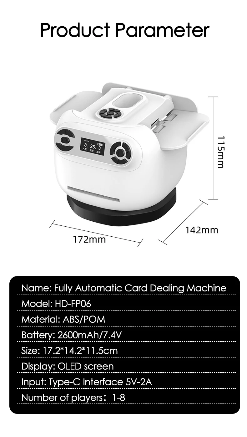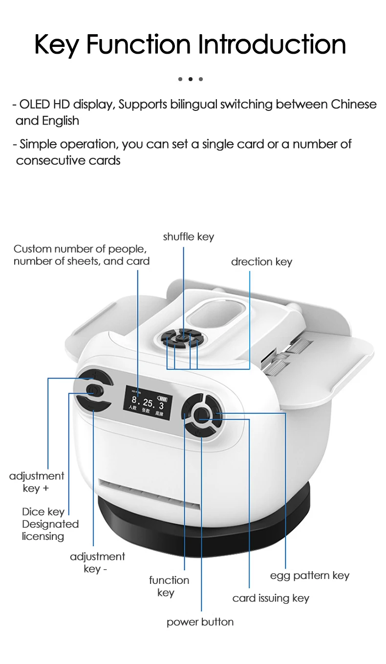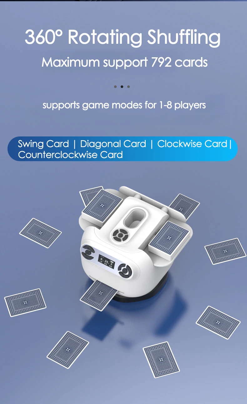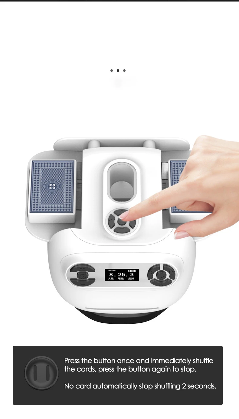 【Operação intuitiva e suporte multijogador】Apresentando uma tela digital fácil de usar de 1,3 polegadas com instruções claras, este shuffler lida sem esforço com 2 decks simultaneamente e suporta modos de jogo para 1 a 8 jogadores.